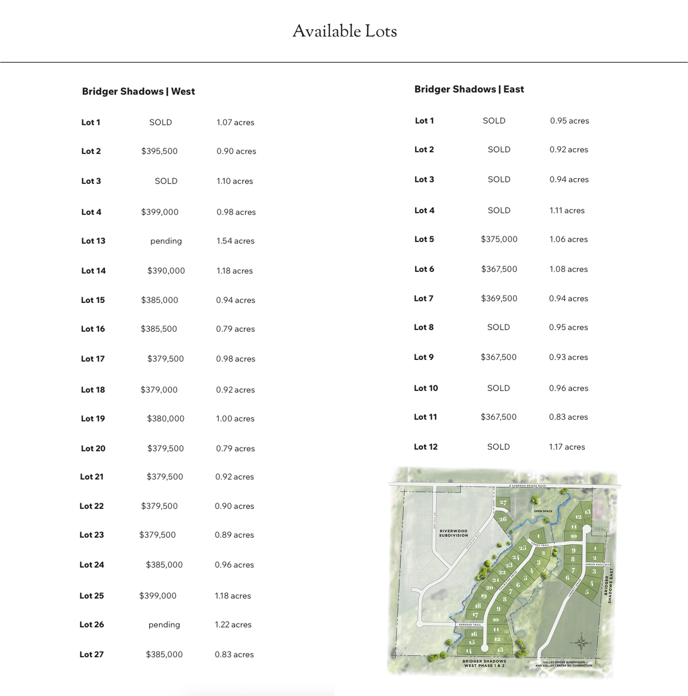 Bridger Shadows welcomes collaboration with builders and developers. Multiple-lot pricing and attractive terms are available. With spacious homesites, a desirable location, and increasing demand for quality homes in the Gallatin Valley, this community is positioned for long-term success.